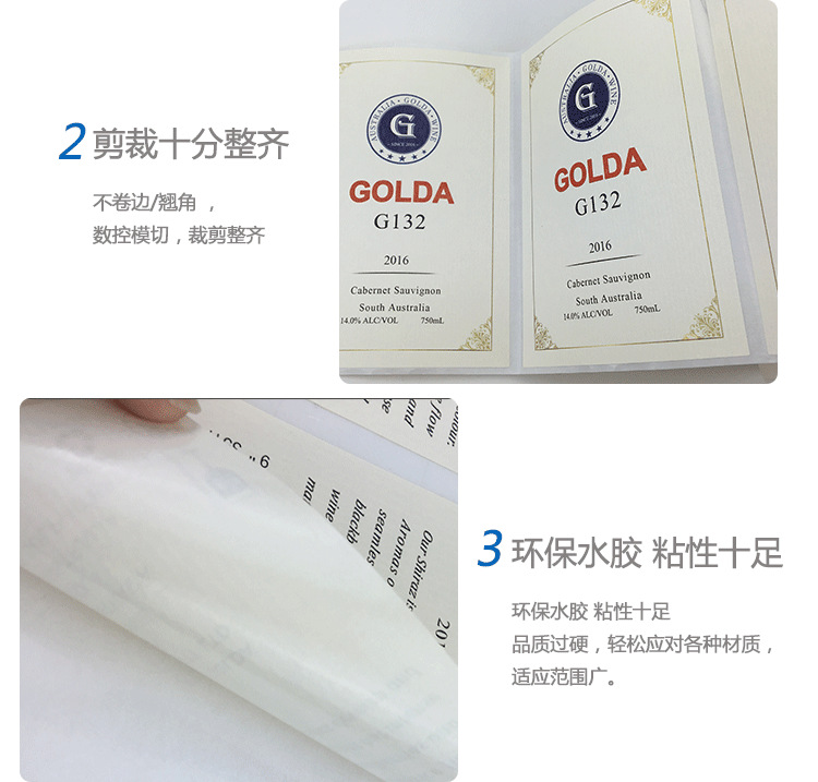 產(chǎn)品名稱:酒類不干膠標簽紙 顏色:單色、四色、專色 使用膠型:油膠、水膠、熱熔膠 規(guī)格:根據(jù)客戶自己定制 形狀:圓形、長方形、橢圓形、自定義形狀等 使用底紙:黃色離型紙,白色離型紙,白色格拉辛等 材質(zhì):鏡面不干膠,PVC不干膠,易碎紙,銅板不干膠,牛皮紙等