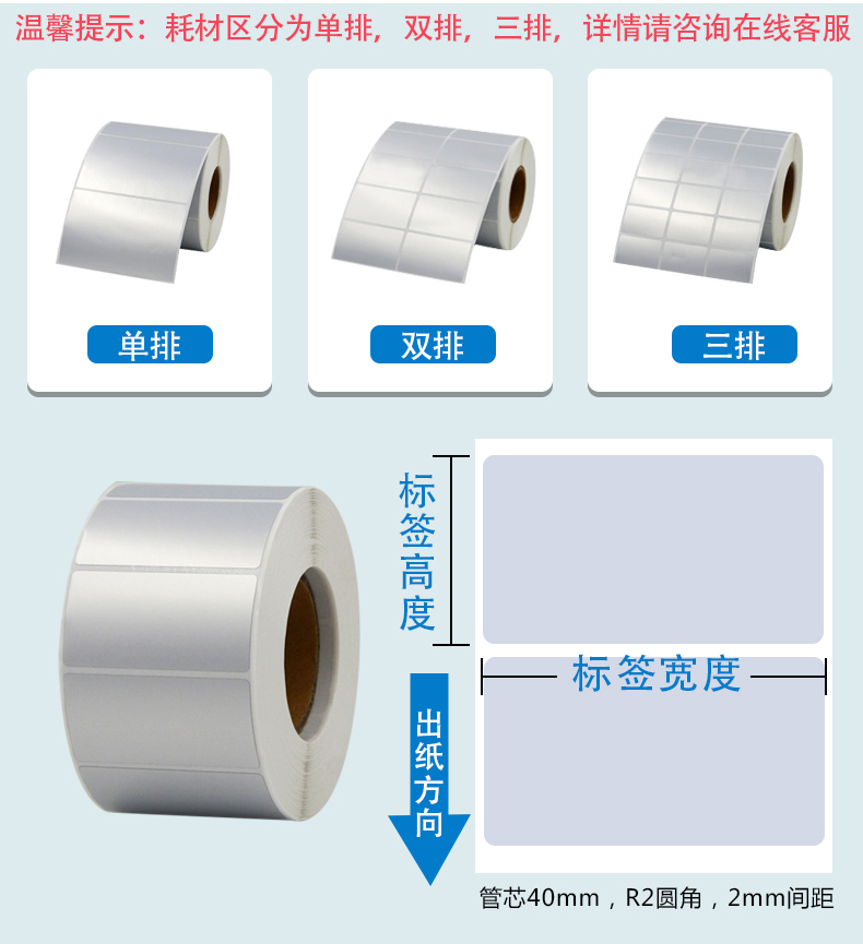 材質:啞銀標簽紙 膠水:水膠 規格:單排 雙排 三排 四排 打印方式:熱轉印打印 搭配碳帶:需要碳帶 實用機型:有熱轉印打印機功能的打印機 應用范圍:廣泛應用于超市,餐飲,酒店,銀行,電信,醫療等各個行業