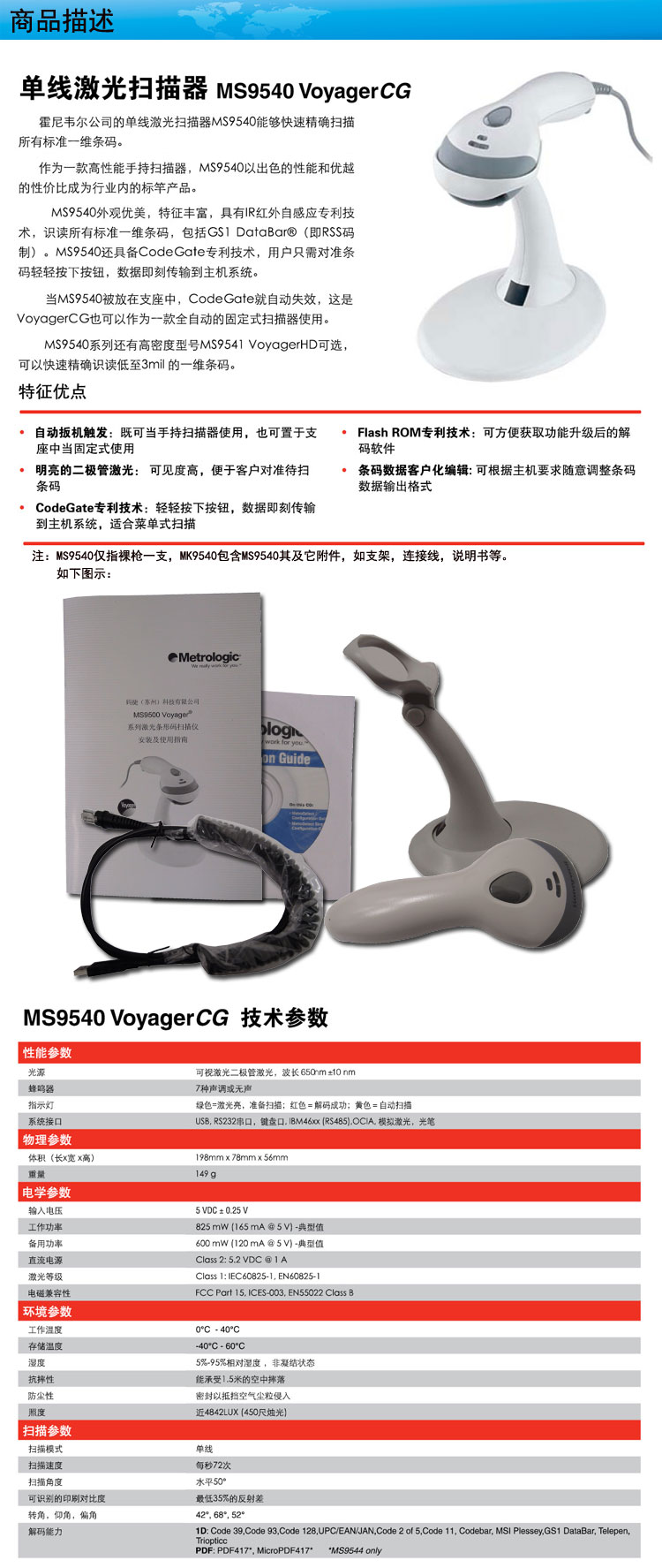 霍尼韋公司的單線激光掃描器MS9540能夠快速精確掃描所有標準一維條碼。作為一款高性能手持掃描器,MS9540以出色的性能和有約的性價比成行業內的產品。