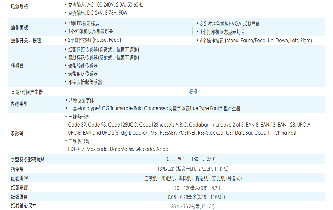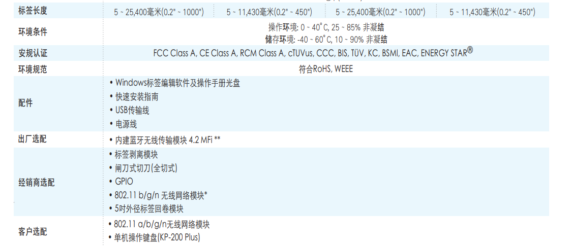 選配包含: 卷標剝離模塊、5吋外徑卷標回卷模塊、GPIO、內建式藍牙、802.11 a/b/g/n無線網絡模塊、一般切刀