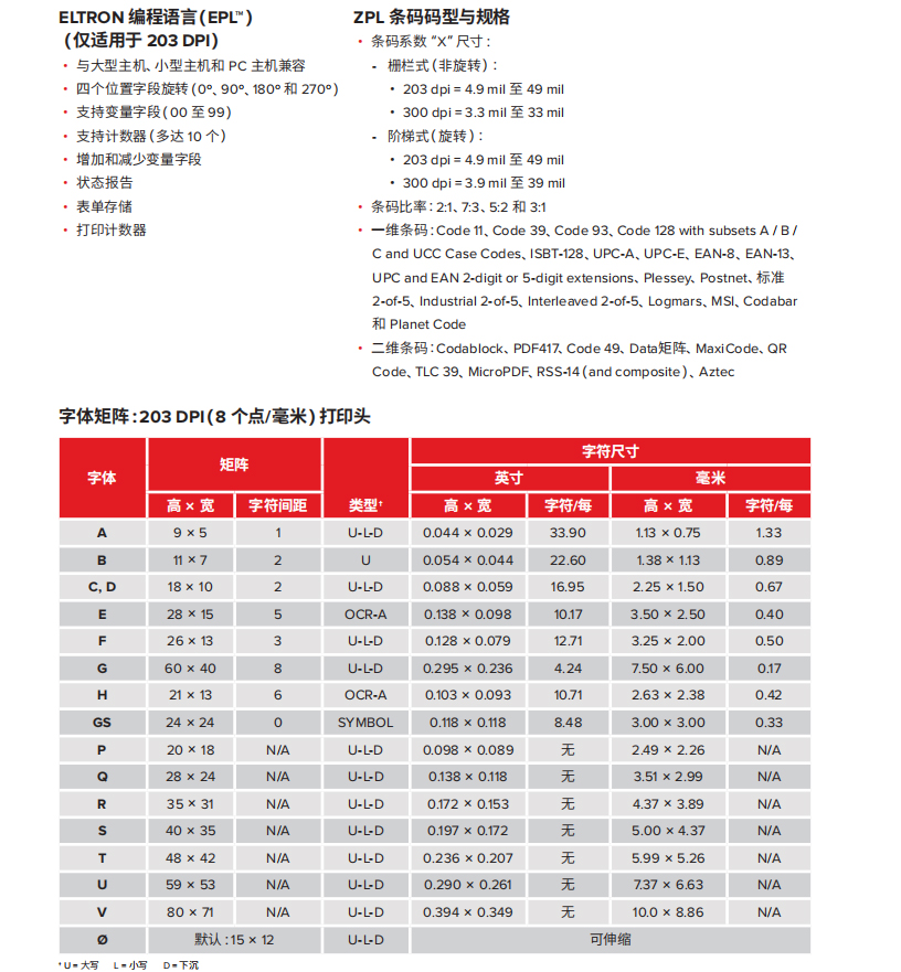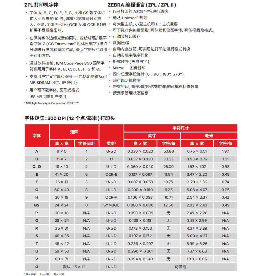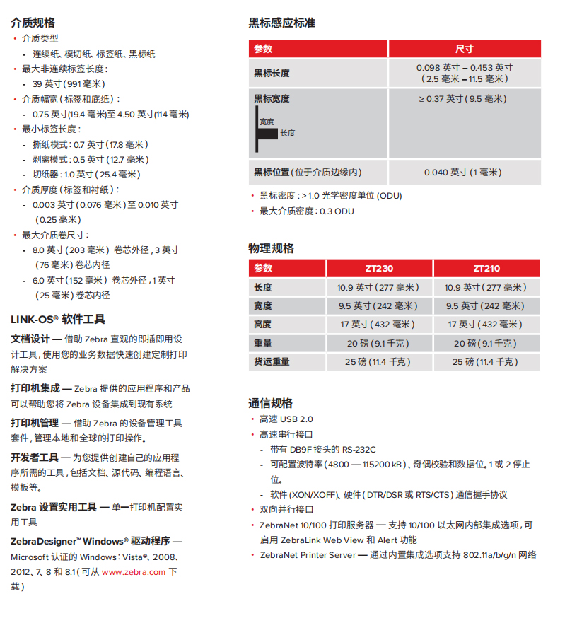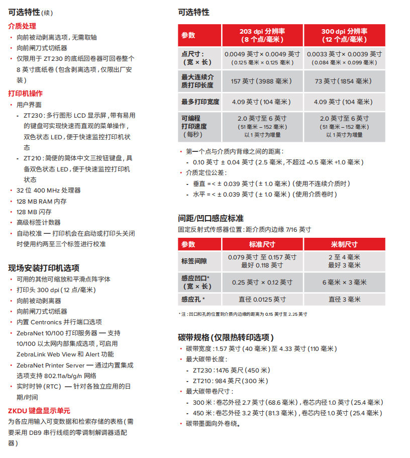 以下規(guī)格僅供參考,并且基于使用Zebraa? 原廠耗材對 ZT200? 工業(yè)系列打印機(jī)所進(jìn)行的測試。測試的結(jié)果會因?qū)嶋H的應(yīng)用設(shè)置或使用非建議的Zebra品牌耗材而存在差異。Zebra始終建議通過測試來檢驗(yàn)應(yīng)用。