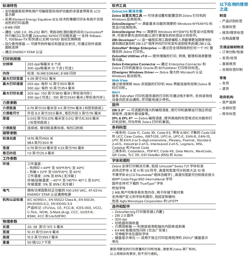 105SLPlus充分利用Zebra經實踐驗證的電子平臺,可滿足大批量應用的需要——包括大容量存儲以存儲格式、字體和圖形。Element Energy Equalizer? (E3?) 技術能夠延長打印頭的壽命并提供出色的打印品質。105SLPlus采用全金屬結構,具備Zebra享有盛譽的出色耐用性,可承受制造和倉儲環境中常見的碰撞。這款打印機專為全天候使用而設計,